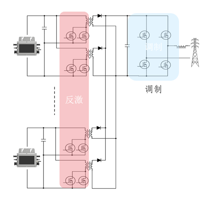 微型逆變器,一般指的是光伏發(fā)電系統(tǒng)中的功率小于等于1000瓦、具組件級MPPT的逆變器,全稱是微型光伏并網(wǎng)逆變器?!拔⑿汀笔窍鄬τ趥鹘y(tǒng)的集中式逆變器而言的。傳統(tǒng)的光伏逆變方是 將所有的光伏電池在陽光照射下生成的直流電全部串并聯(lián)在一起,再通過一個逆變器將直流電逆變成交流電接入電網(wǎng);微型逆變器則對每塊組件進行逆變。其優(yōu)點是可以對每塊組件進行獨立的MPPT控制,能夠大幅提高整體效率,同時也可以避免集中式逆變器具有的直流高壓、弱光效應(yīng)差、木桶效應(yīng)等。