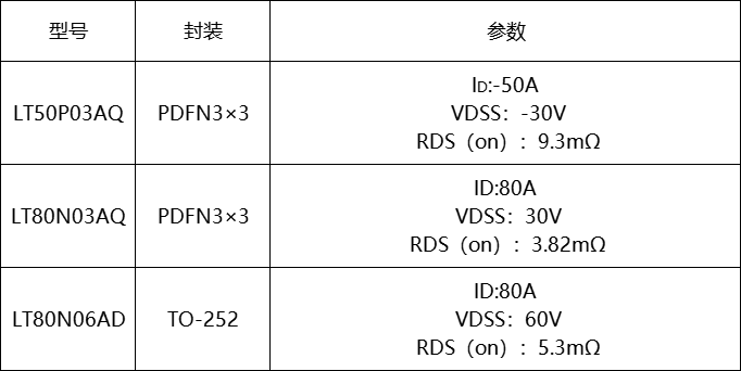 為了實(shí)現(xiàn)過充保護(hù)的功能,選擇MOS管需要多方面考慮。首先需要考慮封裝大小,需要是配合內(nèi)部布局;其次考慮其耐壓能力、導(dǎo)通電阻、開關(guān)速度等參數(shù)。不同類型的MOS管的應(yīng)用場景不同。比如較為常用的NMOS用在高頻應(yīng)用,而PMOS通常用在低端的開關(guān),而在選擇MOS管類型,除了考慮以上的重要參數(shù)外,還要考慮應(yīng)用場景和成本因素。推薦以下三款型號,LT50P03AQ、LT80N03AQ、LT80N06AD。