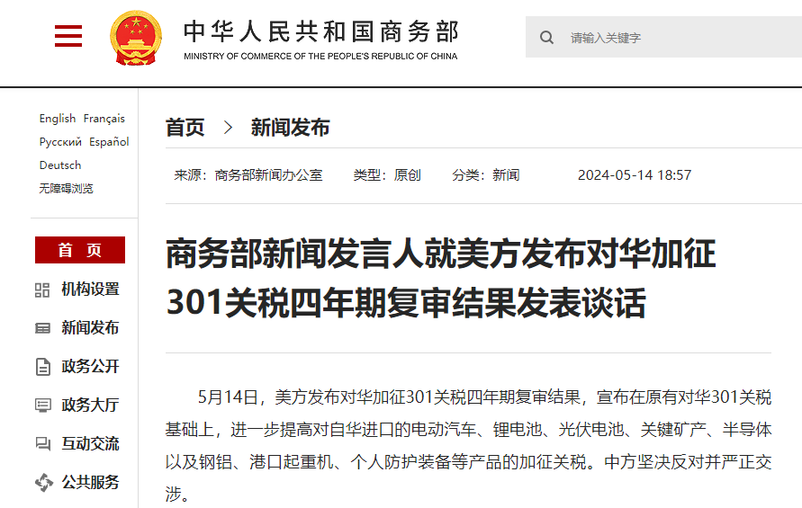 對此,中方堅(jiān)決反對并嚴(yán)正交涉。美方出于國內(nèi)政治考慮,濫用301關(guān)稅復(fù)審程序,進(jìn)一步提高部分對華產(chǎn)品加征的301關(guān)稅,將經(jīng)貿(mào)問題政治化、工具化,是典型的政治操弄,中方對此表示強(qiáng)烈不滿。世貿(mào)組織早已裁決301關(guān)稅違反世貿(mào)組織規(guī)則。美方非但不予以糾正,反而一意孤行,一錯(cuò)再錯(cuò)。